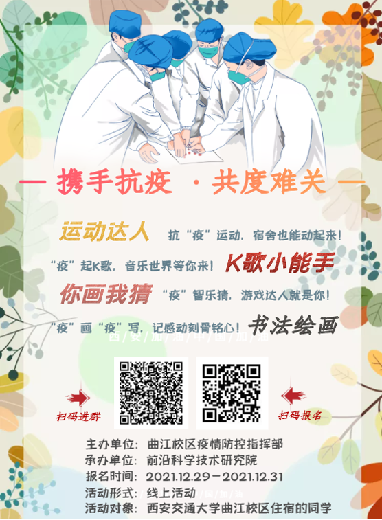为了使大家的宿舍生活充实起来,由曲江校区疫情防控指挥部主办、bwin承办线上综合活动,包括:抗“疫”运动、“疫”起K歌、“疫”智乐猜、“疫”画“疫”写。青年志愿者先锋队组织开展本次活动,希望能够在这个寒冷的冬天给大家带来温暖,增加大家抗击疫情、取得胜利的信心,营造积极向上、健康文明的文化氛围,充分展示曲江校区学生蓬勃向上的精神风貌。