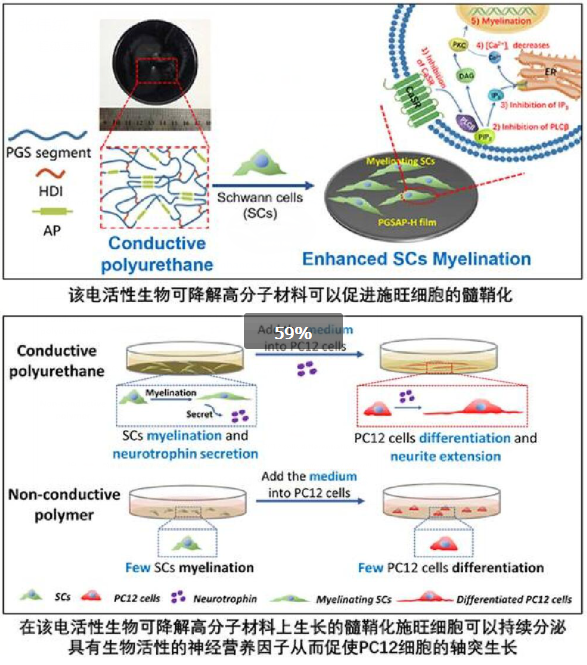 外周神经系统的损伤会导致感觉与运动神经功能的减退甚至消失,从而显著降低患者的生活质量。在外周神经系统的修复和治疗过程中,髓鞘化的施旺细胞可以分泌各种神经营养因子来引导神经元的生长和再生,因此促进施旺细胞的髓鞘化对于外周神经系统再生和修复起着十分重要的作用。然而,目前用于促进施旺细胞的髓鞘化的方法如对施旺细胞进行MicroRNA修饰或是利用外界刺激等方式十分复杂繁琐,因而难以在临床上研究及应用。相比之下,利用功能化生物材料直接促进施旺细胞的髓鞘化是一种非常简单而高效的方法。