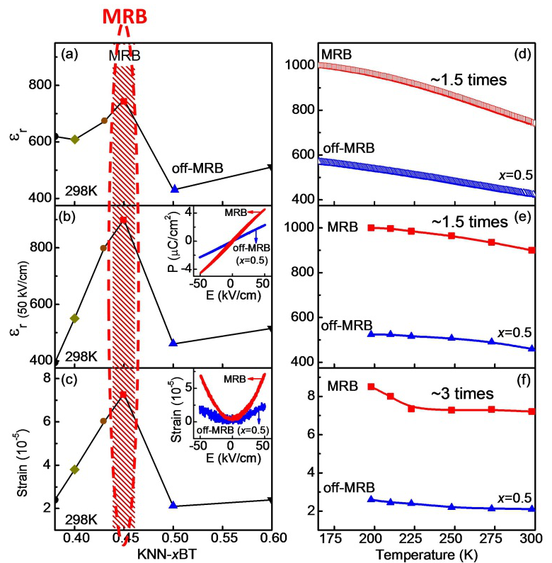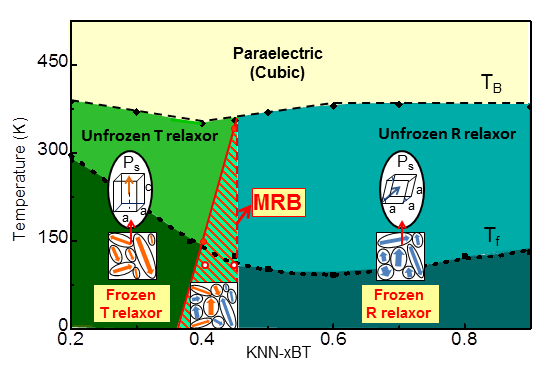 杨阳和纪元超等人首次在弛豫铁电体体系中提出了一种全新的物理概念——准同型弛豫体边界(Morphotropic Relaxor Boundary,MRB),并发现其能够数倍增强弛豫铁电体性能。具体表现为:在报道的铌酸钾钠—钛酸钡(KNN-BT)弛豫铁电体体系中,跟非MRB成分相比,MRB成分实现了在超过100摄氏度的宽温域范围内,近1.5倍的介电性能增强以及近3倍的电致伸缩效应的增强。MRB增强弛豫铁电体性能机制,类似于传统铁电材料中的准同型相界增强机制。论文作者发现弛豫铁电体虽然宏观上表现为单一“顺电相”的特征,但是微观尺度上具有不同晶体对称性的PNRs,即存在四方弛豫铁电体(T relaxor)和三方弛豫铁电体(R relaxor)。然后,作者利用的PNRs能够具有不同的对称性,构建MRB,从而在MRB成分处实现了增强弛豫铁电体性能的目标。