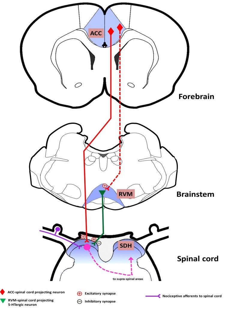 外周的痛觉刺激强度和人体感受到的疼痛程度往往不一致。比如人很兴奋的时候会忽略身体的疼痛。相反,轻微的刺激可能引发剧烈的疼痛。典型的例子是有些人对于打针若无其事,有些人却疼痛难忍。其原因主要在于脑内存在一个疼痛调控系统,该系统可以对外周传入的痛觉刺激产生抑制或增强的效应,最终使得感觉皮层接收到的的疼痛信息被减弱或增强。近30年的研究一直认为,脑内的痛觉调控系统仅源自于脑干。然而,目前的研究结果表明,ACC下行至脊髓的调控通路并不通过脑干的介导。在阻断脑干神经元活性的情况下,ACC刺激依然能够增强脊髓的兴奋性感觉信息传递。因此,该研究也是对以往脑干-脊髓下行调控,尤其是下行易化调控的重要补充。