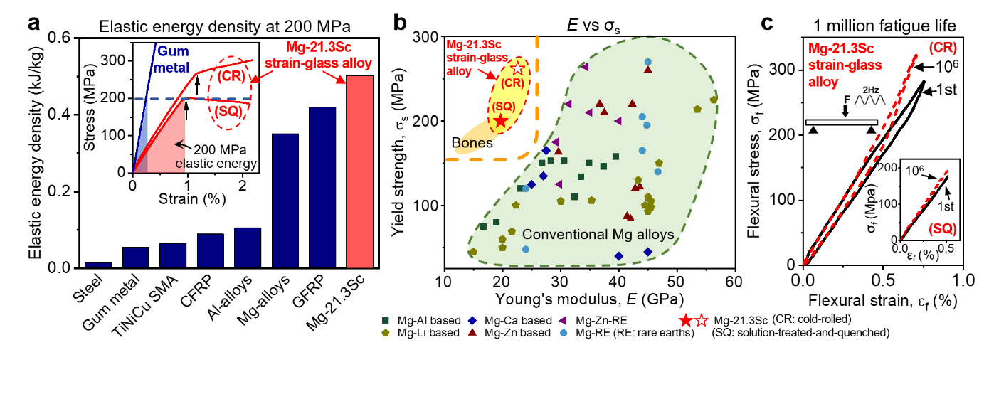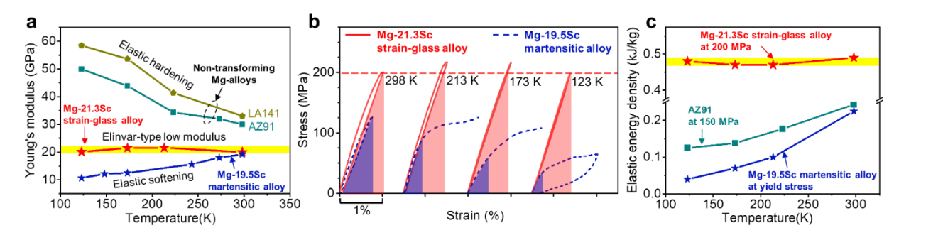近日,西安交大bwin铁性智能材料研究团队在轻质镁钪合金中通过调控成分设计了独特的“应变玻璃”合金——具有冻结纳米马氏体畴的合金,该合金在200 MPa工作应力和宽温域下显示出稳定的高弹性储能密度,属于轻质低模量恒弹性合金。该轻质应变玻璃合金(密度仅为2g/cm3,与工程塑料相当)利用应变玻璃的适量弹性软化性质抵消其固有的弹性硬化,克服了上述原理性难题,实现了从室温到-150℃宽温域下的恒定低模量(20-23 GPa),同时具有镁合金中最高屈服强度等级(200-270 MPa)和百万次量级的疲劳寿命,这一优越性能有望使该合金在航空航天等高科技领域得到广泛应用。