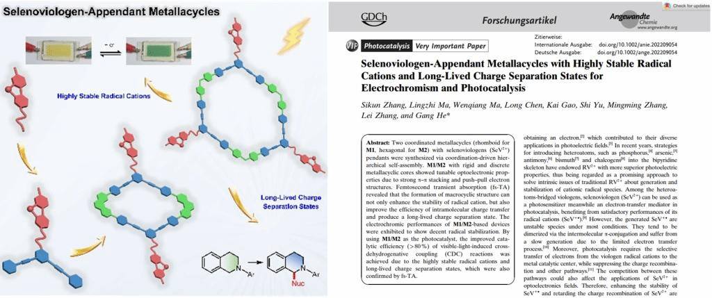 紫精衍生物因其独特的氧化还原性质而备受学术界和工业界的关注。含硒紫精衍生物(SeV2+)的开发不仅解决了传统紫精分子(双季铵化的4,4’-联吡啶盐)共轭程度低,可见光吸收弱等不足,还可通过其优异的电子转移特性构筑一系列光催化体系,为实现太阳能的高效转换提供可能。然而,含硒紫精小分子依然存在着自由基阳离子(SeV+•)稳定性差,分子电荷分离效率低等问题,阻碍了含硒紫精在高效光催化中的进一步发展。尽管扩大π共轭体系、引入给电子或吸电子基团等方法可在一定程度上增强含硒紫精阳离子自由基的稳定性和生成效率(Angew. Chem. Int. Ed. 2022, 61, e202115298; Adv. Sci. 2022, 9, 2101652),但并不能从本质上解决上述问题。