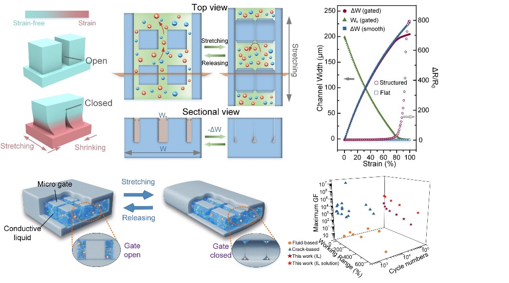 此外,该团队将“仿生门控”传感新模式应用于柔性应变传感领域,通过应变驱动微结构门控开关实现离子导电通道开合,开发了可编程门控流体应变传感器,如图2所示。将离散微柱阵列构建的门控结构分布在微流道内,与填充在门控间隙内的离子液体形成门控流体式应变结构,利用泊松效应引发的非均匀变形驱动门控结构打开和闭合,获得了高达上万的应变系数(GF最大值45300)、大拉伸能力(>500%)以及长时间传感的稳定性与可靠性(拉伸循环超过80000次),应变传感器的灵敏度和测量范围可以通过门控结构的参数设计按需调控,从而获得传感大量程与高灵敏的匹配。以此开发的柔性可穿戴应变传感器实现了人体微小脉搏、发声等生理信号以及大幅肢体运动姿态等全范围的人体活动监测,在可穿戴医疗康复领域具有重要应用前景。