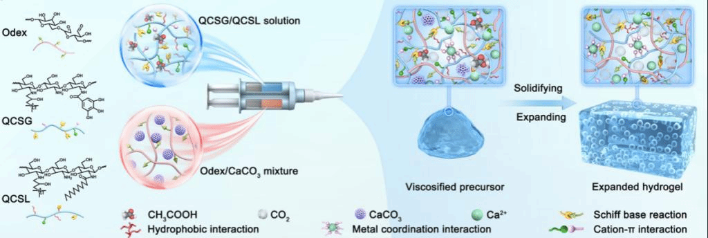 为解决以上问题,课题组在前期研究基础上,在水凝胶粘合剂中引入自膨胀和自推进性能特点,开发了一种可注射可降解的席夫碱水凝胶生物活性粘合剂。这种生物活性粘合剂具有优异的抗菌和促凝血性能、快速自膨胀和自推进性能,以及良好的湿组织粘附性,可用于快速控制大出血。用氧化葡聚糖(OD)交联月桂酸修饰的QCSQCSL)和没食子酸修饰的QCSQCSG)形成水凝胶网络。此外,将多孔碳酸钙和乙酸之间的发泡反应引入到上述双组分水凝胶系统中,以提供自膨胀和自推进性能。