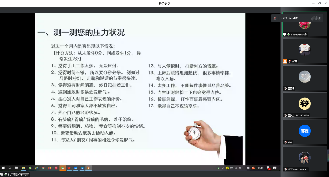 10月27日,bwin特邀心理健康教育与咨询中心、国家二级心理咨询师闫琼老师为同学们带来一场主题为“研究生压力调试与应对”的精彩线上讲座,旨在向前沿学子传播心理健康知识、树立积极健康理念、培养健康生活方式,提高学生的综合素质和适应能力。学院 150余名研究生线上参与此次讲座。